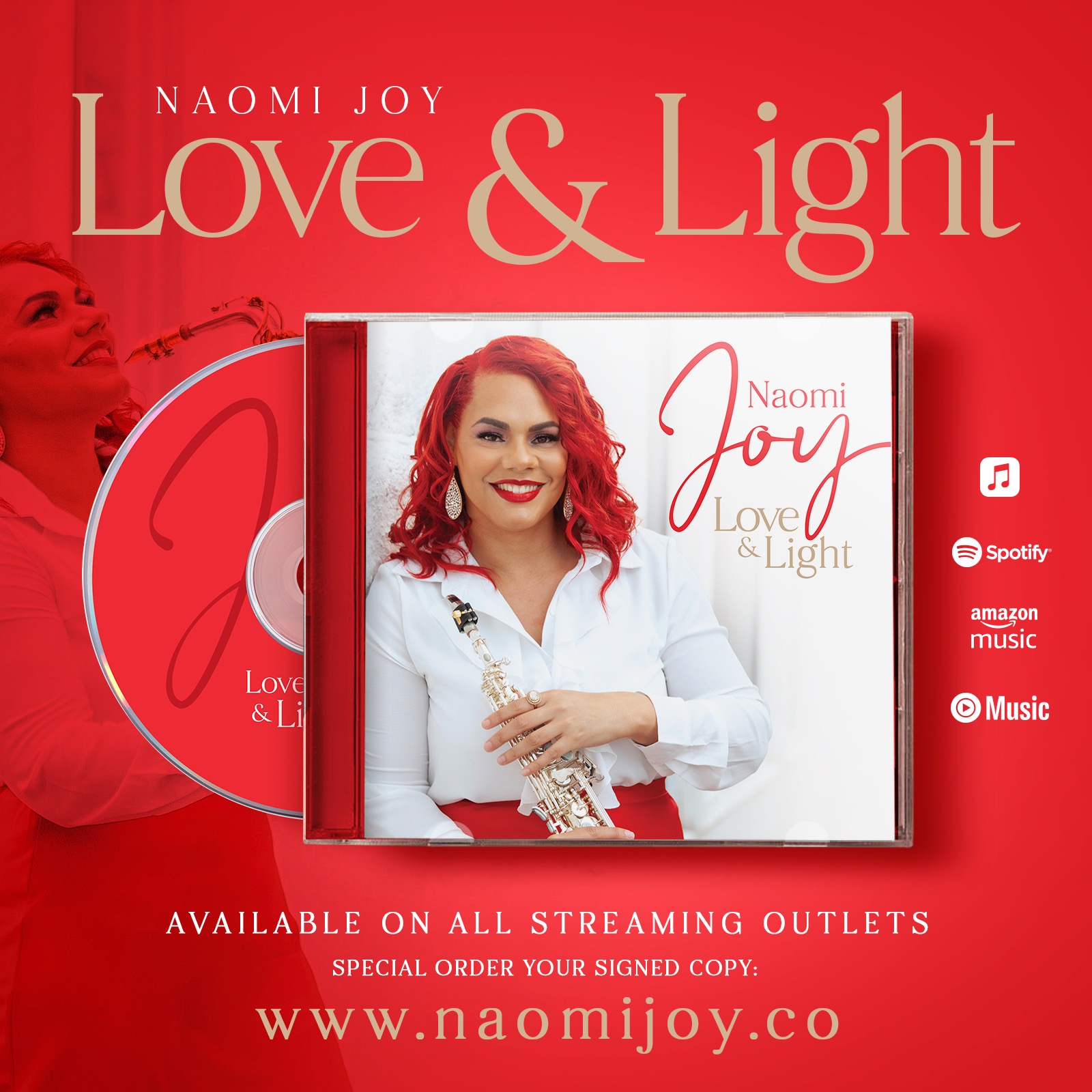 She is an Endorsed Artist with BARI Woodwinds and Dukoff Mouthpieces and has released her 1st Music Album, “Love & Light”. Naomi is also a published author of her 1st Book entitled “My Joy Journey” in which she shares her journey through faith.
